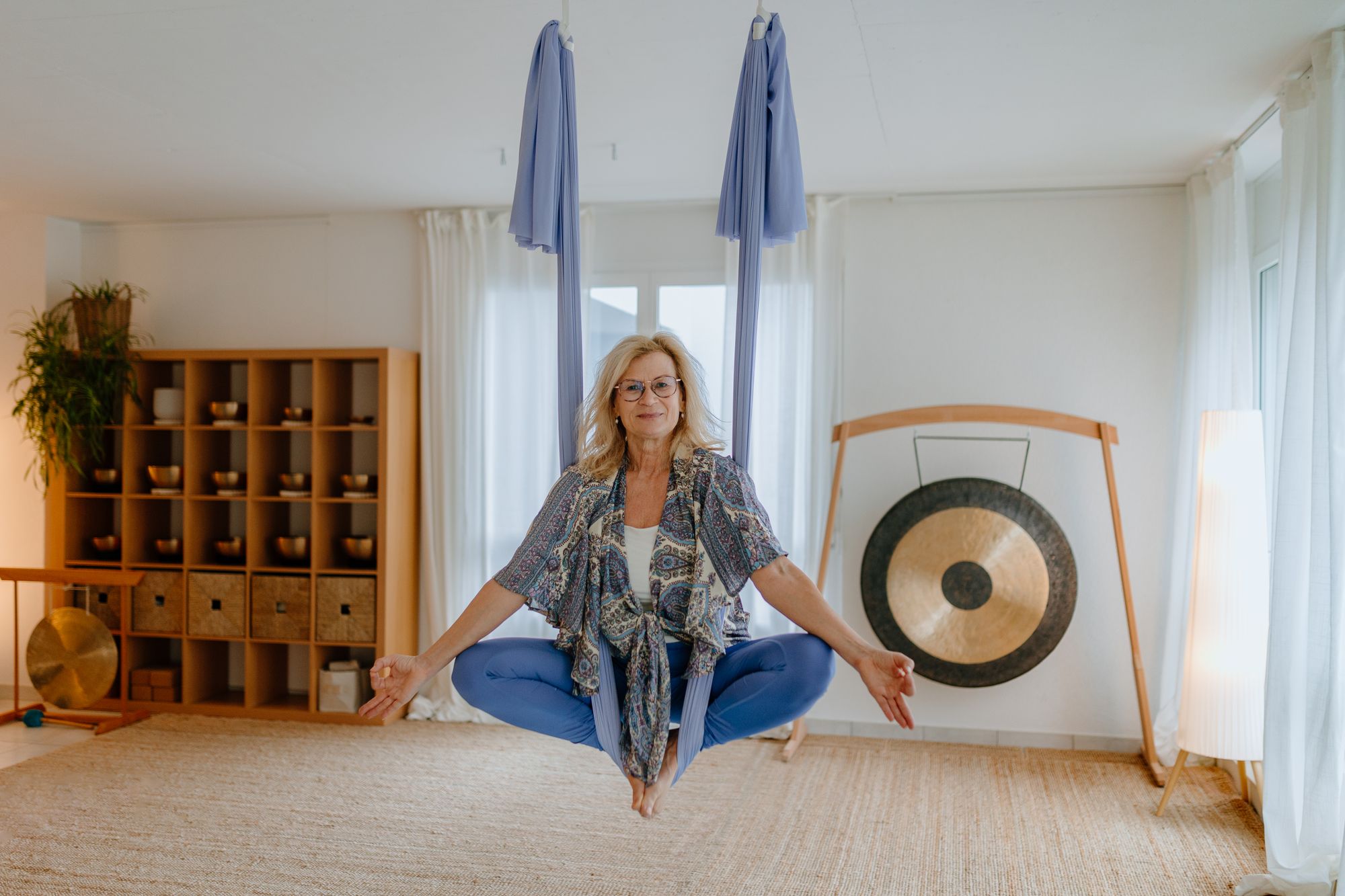 Schwebe getragen im Tuch, spüre Leichtigkeit und Freiheit – und lasse dich von feinen Klangwelten durch die Stunde führen. Aerial Yoga verbindet spielerische Bewegung, sanfte Kräftigung und tiefe Entspannung. Während du dich im Tuch sicher gehalten fühlst, eröffnen sich dir neue Perspektiven für Körper und Geist. Die begleitenden Klänge lassen dich noch tiefer sinken – in Vertrauen, Ruhe und Losgelöstheit. Ein Erlebnis, das dich schwebend erdet. Privatlektionen werden auch angeboten.